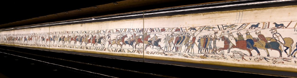 Pour rappel, la tapisserie de Bayeux est l’une des plus célèbres broderies de l’histoire. Mesurant 70 mètres de longueur, elle raconte la conquête de l’Angleterre par Guillaume le Conquérant et se termine sur la bataille d’Hastings de 1066. Elle a été réalisée au XIᵉ siècle et est inscrite depuis 2007 au registre « Mémoire du monde » par l’UNESCO.