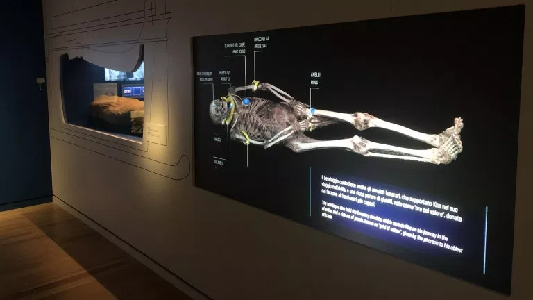 Le parcours scénographique de l’exposition est basé sur le numérique. Plusieurs films 4K permettent de modéliser en trois dimensions des momies égyptiennes. D’ailleurs, le Museo Egizio de Turin explique que « les momies qui étaient autrefois ouvertes et endommagées par les archéologues sont aujourd’hui analysées avec des tomographies sans que leur intégrité soit compromise ».