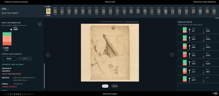 Pour réaliser cette exploration digitale, l’agence a utilisé les travaux d’Augusto Marinoni « Le Codex Atlanticus de Léonard de Vinci: Index alphabétique des sujets ». Il avait catalogué les contenus de Léonard de Vinci en fonction du sujet et de la date de création.
