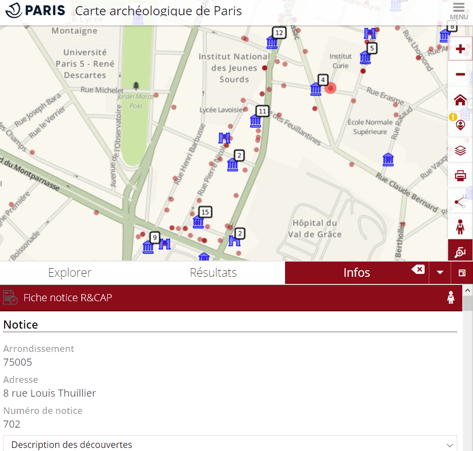 Interactive, la carte est avant tout un outil de travail pour les archéologues afin de recenser les découvertes parisiennes et de les partager avec la communauté de chercheurs. Mais c’est également un outil de collaboration comme l’explique Julien Avinain, archéologue et chef de projet de cette cartographie : « Grâce à cet outil on a renoué des collaborations avec la DRAC, l’INRAP (Institut national de recherches archéologiques préventives), les Universités ou le CNRS (Centre national de la recherche scientifique). Cela a permis de nourrir cette cartographie. » D’ailleurs, cette carte a vu le jour après six années de travail pendant lesquelles il a fallu rassembler les données des archives, notamment celles de l’archéologue Théodore Vacquer. Considéré comme le fondateur de l’archéologie parisienne, il a exploré les chantiers des travaux haussmanniens et a ainsi pu faire de nombreuses découvertes dans la deuxième moitiée du XIXe siècle.