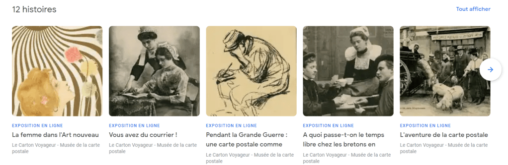 Les cartes postales sont également au cœur de douze expositions en ligne. Parmi elles, on retrouve : « Qui a inventé la carte postale ? », « Comment écrire une carte postale ? », « Illustrations art nouveau » ou encore « Vous avez dit Kitsch ? ». « On a proposé ces animations au musée pour dépasser le côté statique et désuet des cartes postales », explique Sixtine Fabre, responsable partenariats de Google Arts & Culture. « Vous pourrez ainsi découvrir l’histoire de la carte postale ou passer 24 heures dans la vie d’un petit Breton en 1900. »