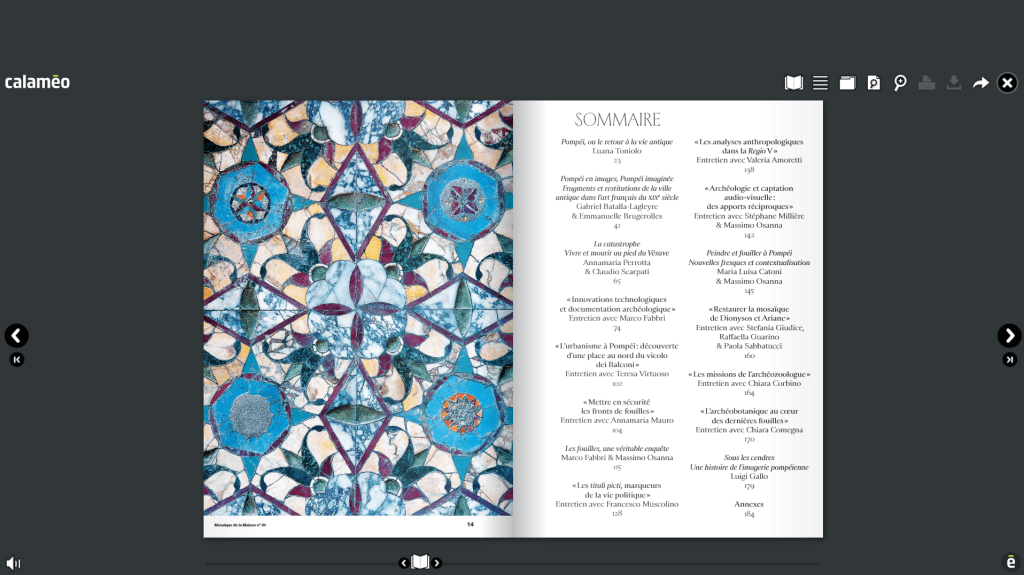 - Des vidéos : quatre précisément, afin de plonger les internautes dans l’univers de Pompéi au travers des nouvelles fouilles et des nouvelles découvertes. Elles portent sur la Maison d’Orion, la Maison au Jardin, la restauration d’une mosaïque et les nouvelles fouilles de Pompéi.