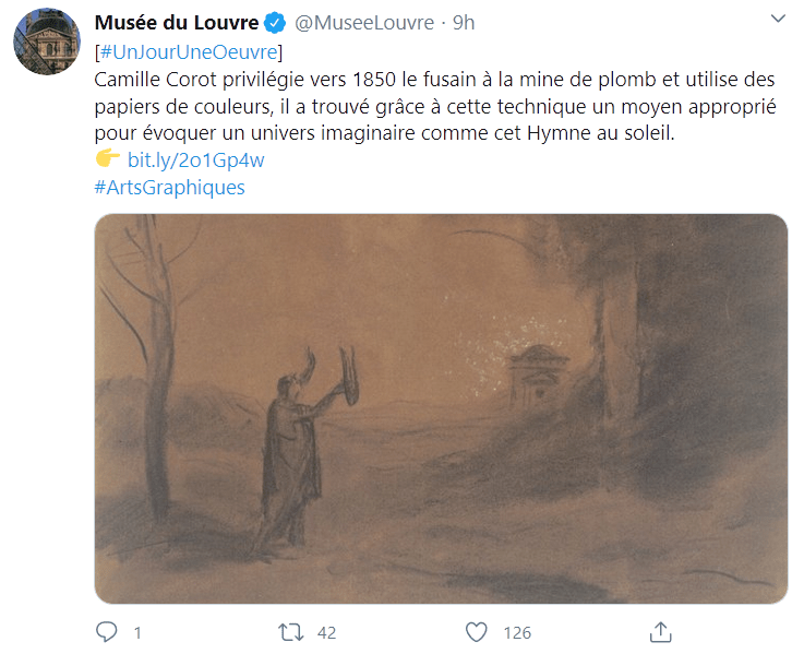 Plusieurs œuvres d’art, exposés au musée, sont également mises en valeur via les réseaux sociaux. L’institution donne rendez-vous quotidiennement à ses followers pour découvrir en images sa collection via les hashtags #UnJourUneOeuvre, #HistoireDulouvre ou encore #LouvreALaLoupe.