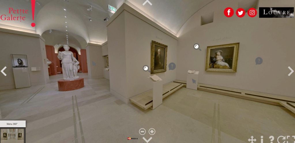 Le Louvre propose trois visites virtuelles au public : une première dédiée aux antiquités égyptiennes, une seconde ayant pour thématique le Louvre médiéval et une troisième sur le sujet des arts décoratifs au sein de la Galerie d’Apollon. Sur le site internet du Louvre, nous pouvons également retrouver les différentes salles répertoriant 30 000 œuvres exposées dans sa base Atlas.