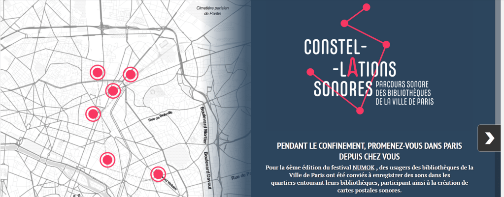 Durant cette période de confinement, le public est invité à découvrir des extraits de « Constellations Sonores ». Il s’agit d’un parcours sonore dans Paris proposé par les bibliothèques de la ville ainsi que Bibliocité, et produit par la société Unendliche Studio dans le cadre du festival Numok.